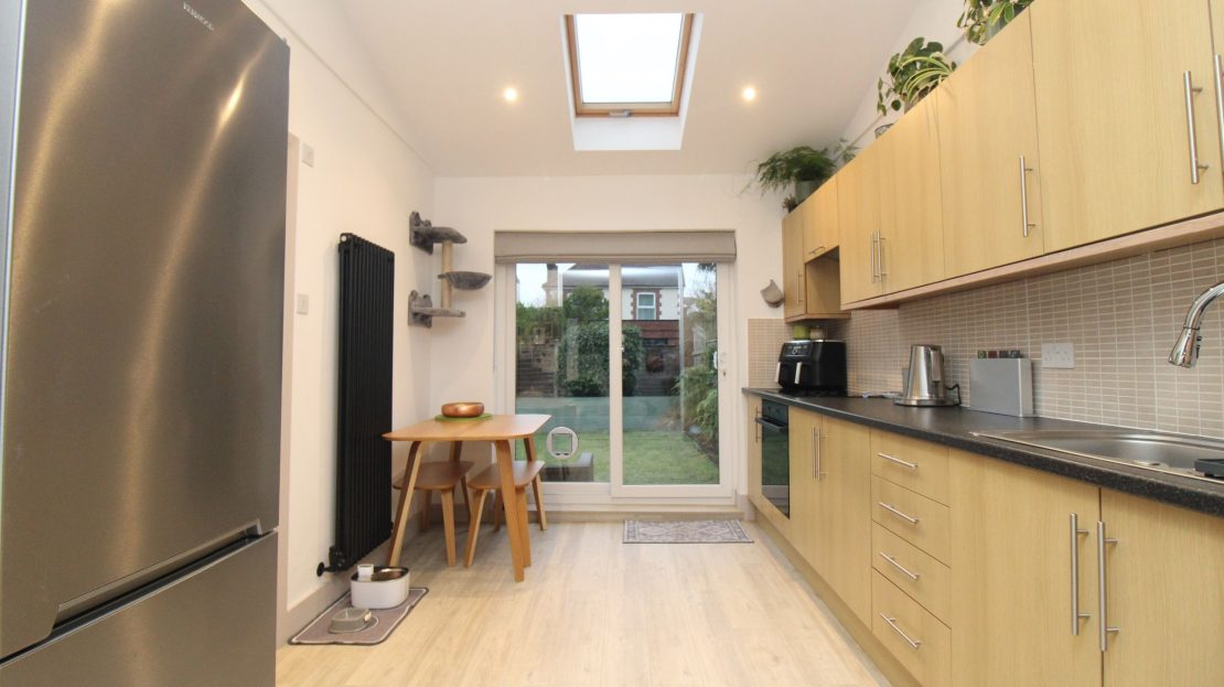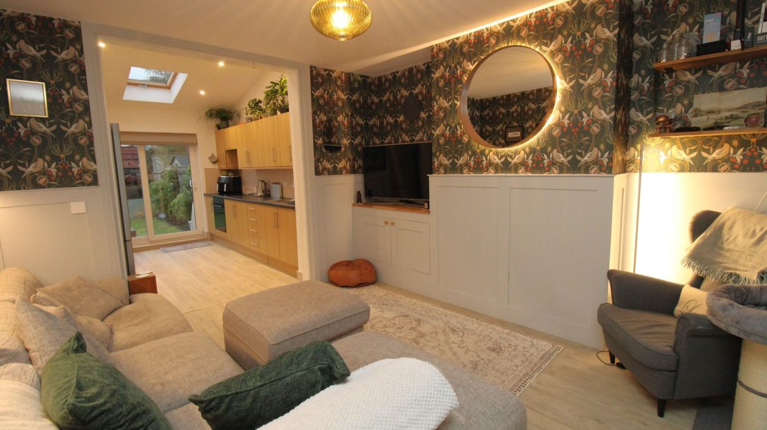 The lounge opens to the kitchen/breakfast room with a vaulted ceiling and roof windows, with a sliding patio door out to the enclosed rear gardens. The modern bathroom/W.C. is located off the kitchen with storage cupboards and a modern suite.