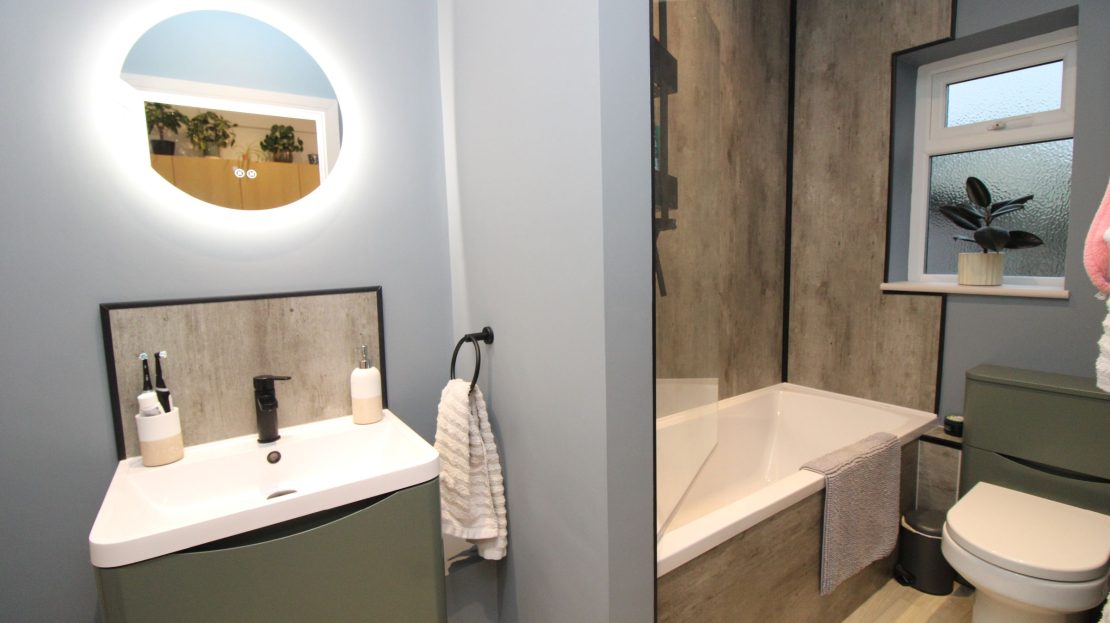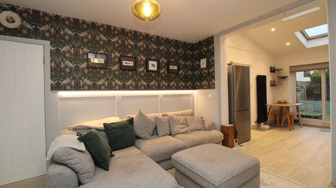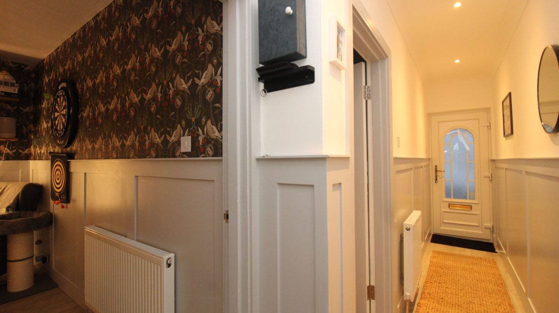 The entrance hall and lounge has feature panelling to walls, with the lounge having inset LED mood lighting for a cosy feel.